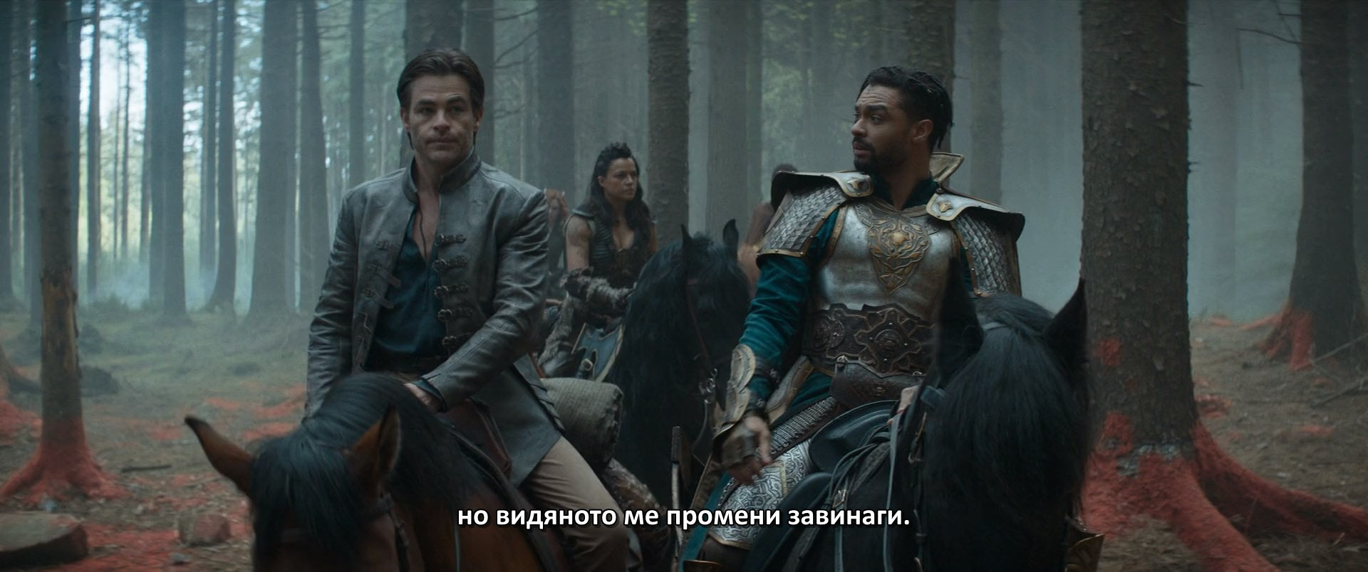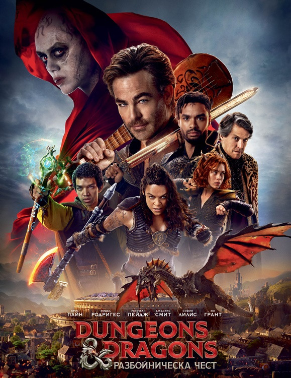## Resume:Приключението Dungeons & Dragons: Разбойническа чест започва, когато изпеченият разбойник и бард Еджин (Крис Пайн) и неговият партньор – варварката Холга (Мишел Родригес) се заемат да си върнат съкровище, което с право са откраднали, но за нещастие са били заловени. Еджин скоро открива, че въпросната ценност е в ръцете на бившия му приятел Фордж (Хю Грант), който също така е отвлякъл дъщеря му Кира (Клоуи Коулман). Тя е затворена в града, който Фордж управлява с помощта на мистериозен съветник Софина (Дейзи Хед) и за да успее да я спаси, Еджин ще има нужда от стабилна помощ. Към него и Холга се присъединяват младият магьосник Саймън (Джъстис Смит), паладинът Зинк (Реге-Жан Пейдж) и друидът Дорик (София Лилис), но ще им стигнат ли силите? Защото докато се отправят на опасната си мисия, бандата разбойници се натъкват на най-голямото зло, познато на света, което, на всичкото отгоре, самите те са отприщили.