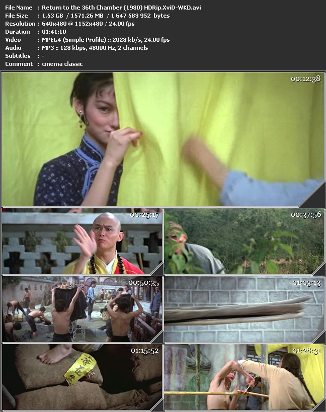 ## Title (in English): Return To The 36th Chamber ## Title (in Bulgarian): Завръщане в 36-те стаи ## Rip type: DVD-Rip ## Genre: Asian ## Producer: Лиу Чиа-Лянг ## Cast: Гордън Лиу, Джони Уанг, Кара Хуей, Сяо Хо, Уей Пай, Чанг Тао ## Nationality: Hong Kong ## Year: 1980 ## Length: 1 h 41 min 10 s ## Video stream: =