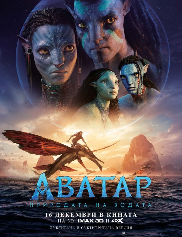 ## Resume:Действието на филма Аватар: Природата на водата се развива 14 години след събитията в Аватар. Джейк Съли (Сам Уортингтън) живее щастливо заедно с Нейтири (Зоуи Салдана) и техните деца, но когато стара заплаха - Аватара на полковник Майлс Куорич надвисва отново над Пандора, двамата са принудени да напуснат дома си, отправяйки се към различни региони на изобилстващата от живот луна и да търсят помощта на други На‘ви племена. Неприятностите обаче ги следват плътно по петите…